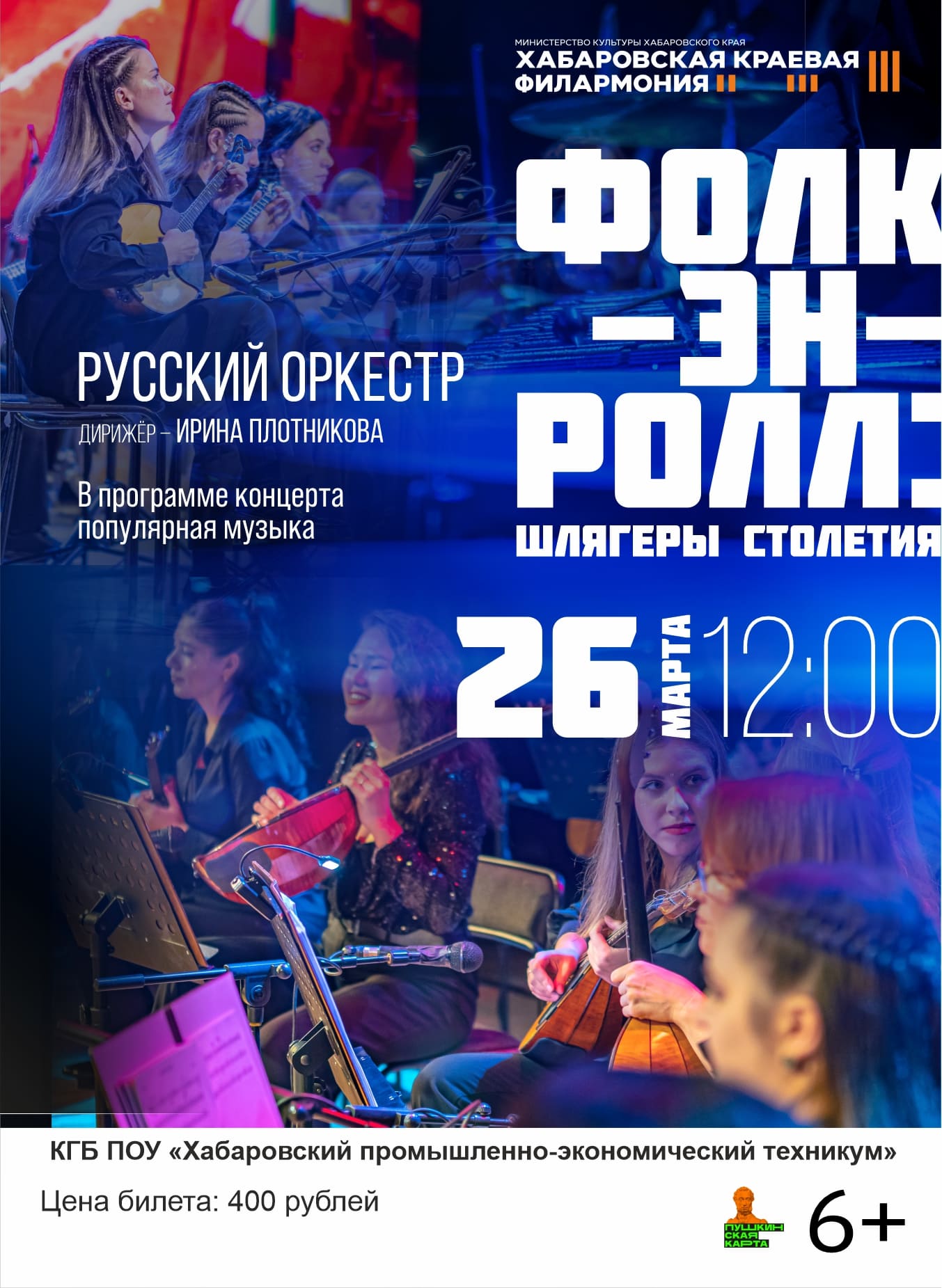 Хабаровская краевая филармония приглашает вас на уникальное событие музыкального гастрольного сезона — концертную программу «Фолк-эн-Ролл: Шлягеры столетия» в исполнении Русского оркестра народных инструментов.