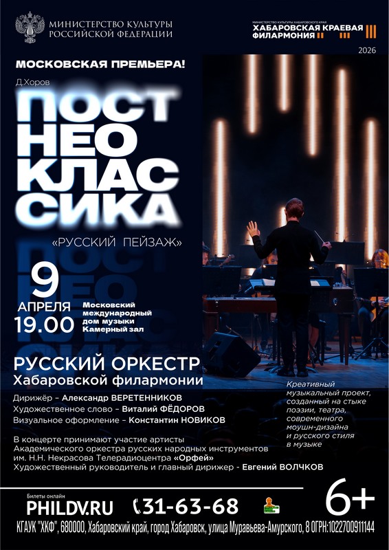 «Post: неоклассика «Русский пейзаж» – московская премьера уникального проекта! Новое, глубоко эмоциональное музыкально-сценическое действо, созданное на стыке поэзии, театра, большого русского стиля в музыке и современного анимационно-графического (моушн) дизайна, заставит зрителей задуматься о вечных ценностях, красоте окружающего мира и месте человека в нем.