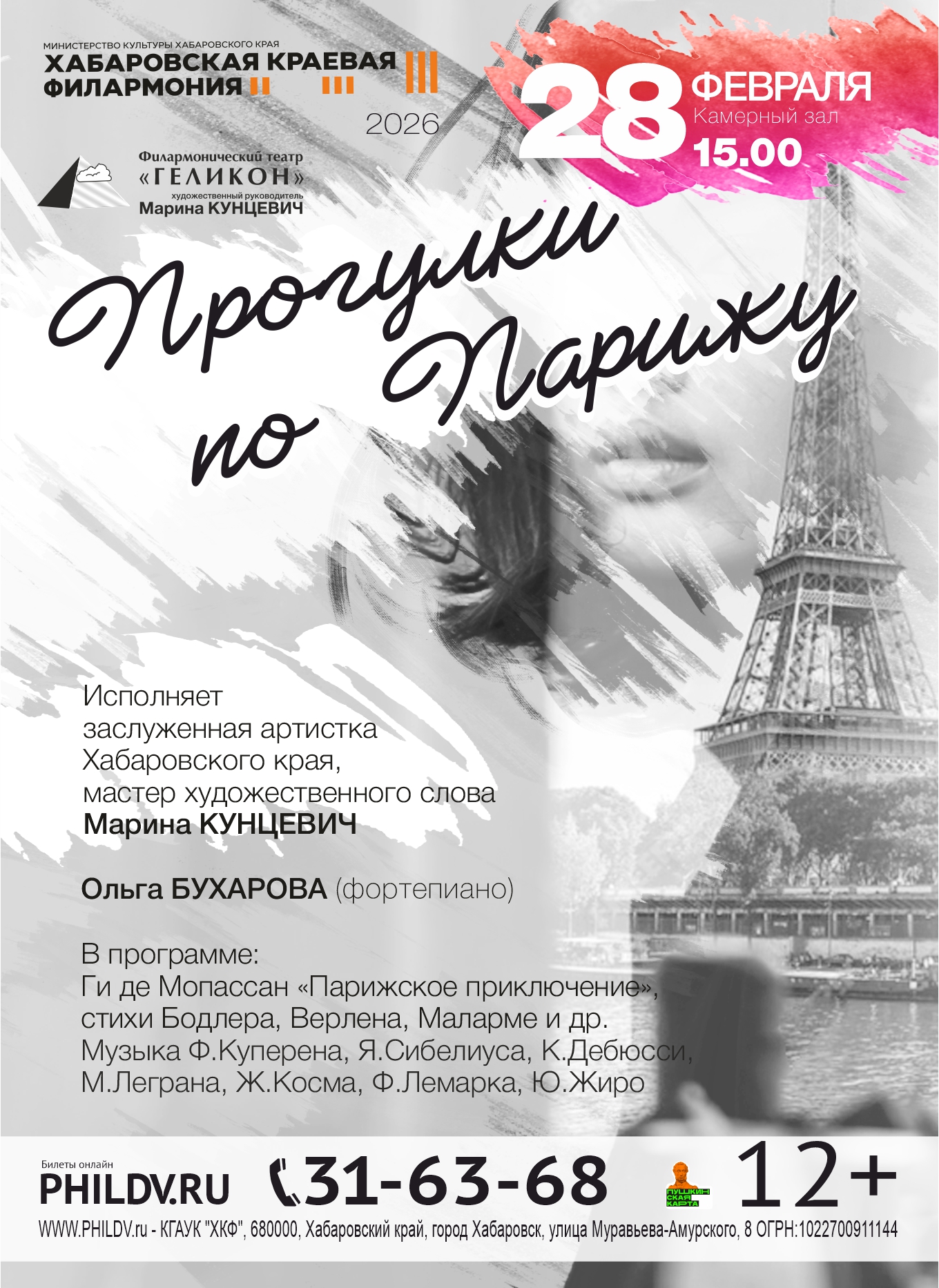 В программе: Ги де Мопассан «Парижское приключение»; фрагменты из прозы А. де Сент-Экзюпери, стихи Ш.Бодлера, А.Рембо, П.Верлена, Ж.Превера; музыка Ф.Куперена, Я.Сибелиуса, К.Дебюсси, М.Леграна, Ж.Косма, Ф.Лемарка, Ю.Жиро